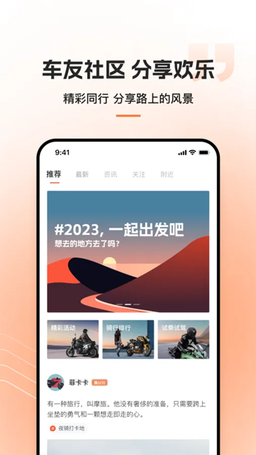 车友互联--丰富的圈层信息,提供官方组织及车友自组织的圈子活动、轨迹分享、动态、排行、周边摩友、关注、话题等,让车友自在交流,出彩骑行。