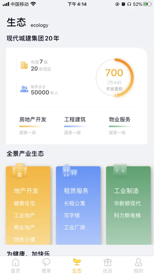 现代城建集团依据行业与市场需求,提出“为健康,加快乐”的全新品牌理念,致力于为客户打造集“好房子、好服务、好生活”于一体的全景生活体验,提供康乐人居一站式解决方案。
