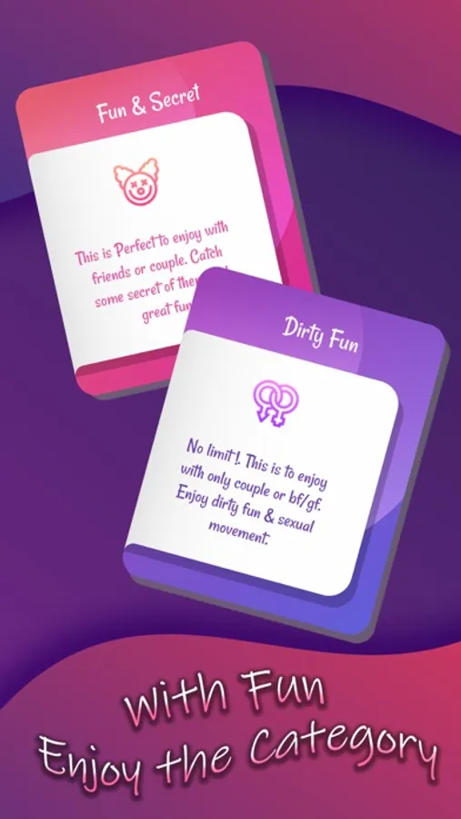 The truths and dares are split into 2 types : Couple & Group. Specially Couple game divided in 2 levels of category, the first ones bring some love in your couple, the last ones are more on the dirty side ;) Find the perfect balance by trying them by yourselves!