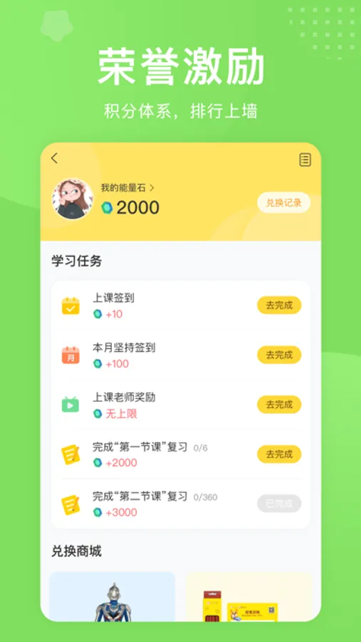 积分能量石奖励,激励孩子每天坚持写字,线下每次按时上课签到,积极参与教学互动,都可以获得积分,积累一定量的积分奖励,可以兑换礼品哦。