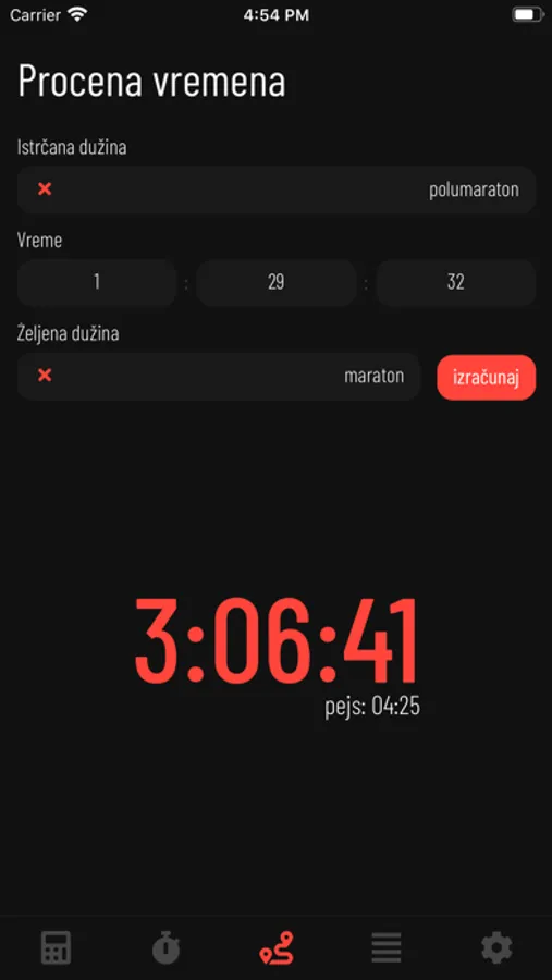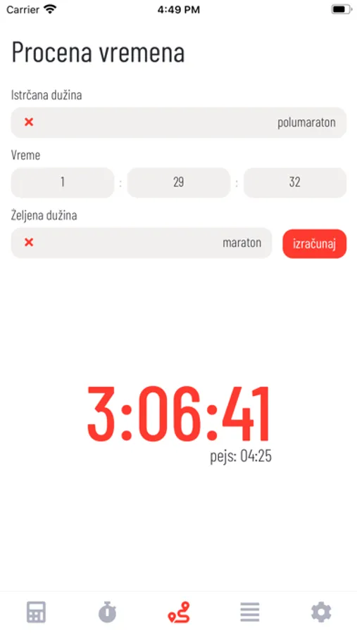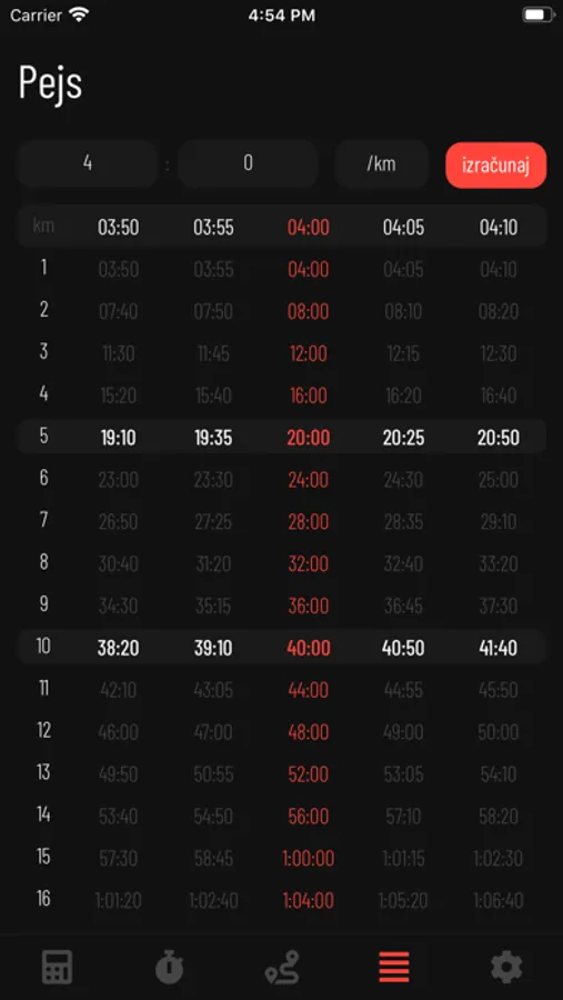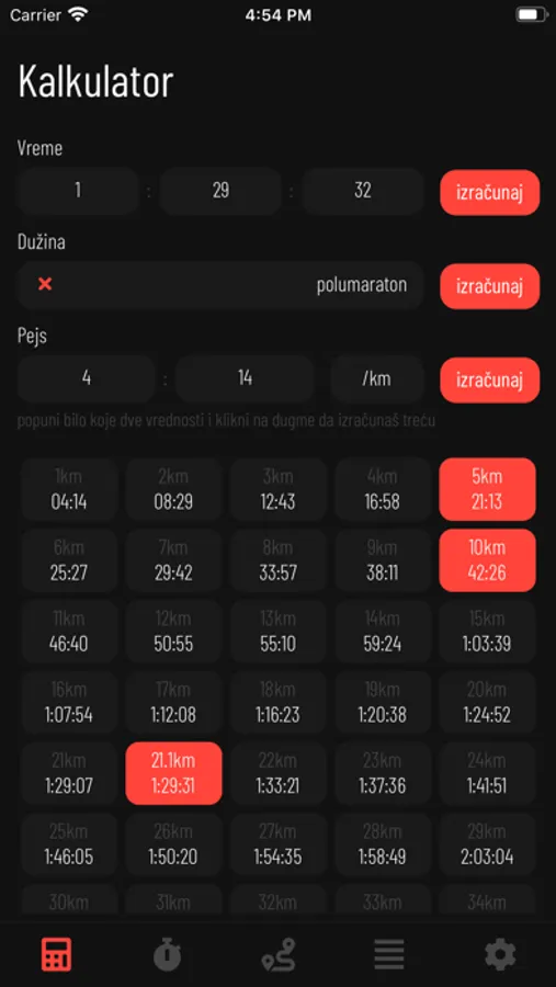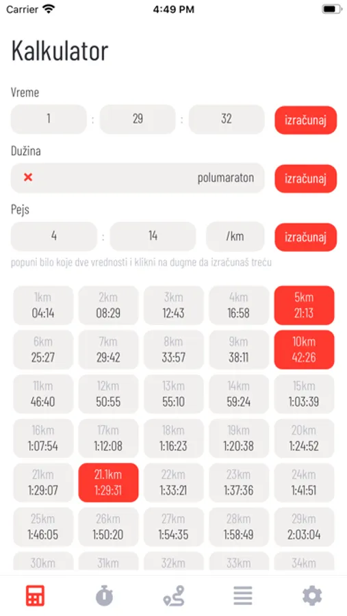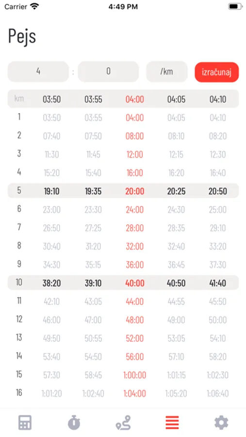 - Za uneti pejs (pace) mogu se videti prolazna vremena za svaki kilometar.
