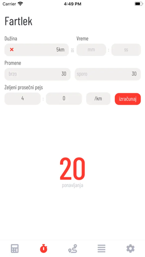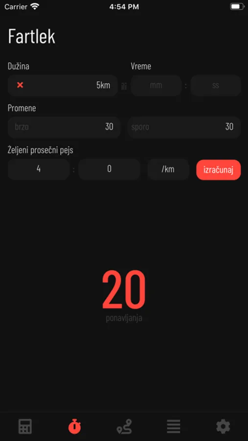 - Za fartlek/intervale je moguće izračunati broj ponavljanja.