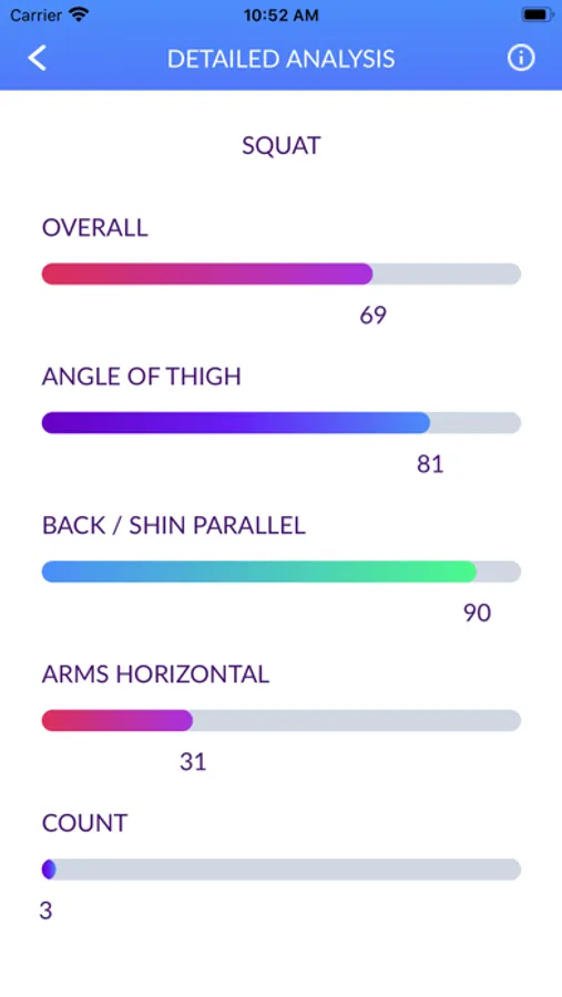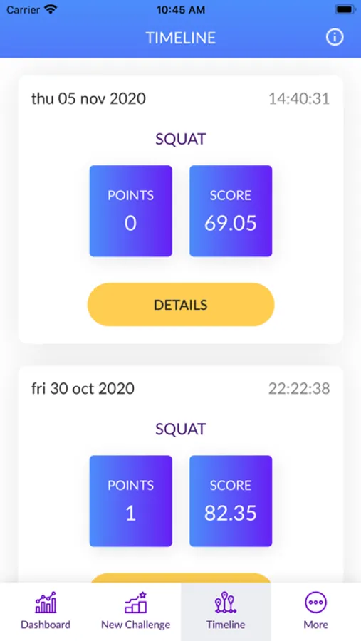 In the showcase version of the App you can practice five routines from simple arm stretch, through squats, bicep curls and forward and backward lunges. Scores are based on measurement of key aspects of each routine as determined by coaching experts. These measurements are converted to scores which allow for different levels of experience and ability as well as age and gender.