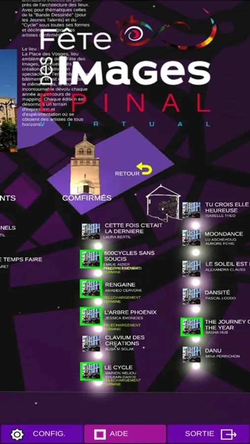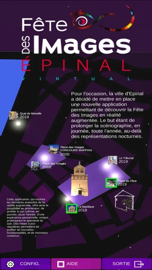 Le but étant de prolonger la scénographie, en journée, toute l'année, au-delà des représentations nocturnes. En téléchargeant l'application, vous aurez la possibilité de viser depuis les Quais de la Moselle l’architecture de la rue du Colonel Sérot ainsi que les façades nord de Place des Vosges, ou encore le beffroi de la Basilique Saint Maurice, la Place de l'Âtre, le Tribunal, et d’en faire jaillir des extraits des anciens spectacles, parfaitement calibrés et calqués sur l’image affichée en temps réel sur son écran. Cette application, qui explore les dernières avancées de la réalité augmentée, offre ainsi la possibilité au promeneur, de profiter à son rythme, en journée, toute l'année, d’une expérience personnelle, unique, prolongeant le spectacle du soir. Des mises à jour régulières permettent de profiter de nouvelles fonctionnalités, et de nouveaux contenus.