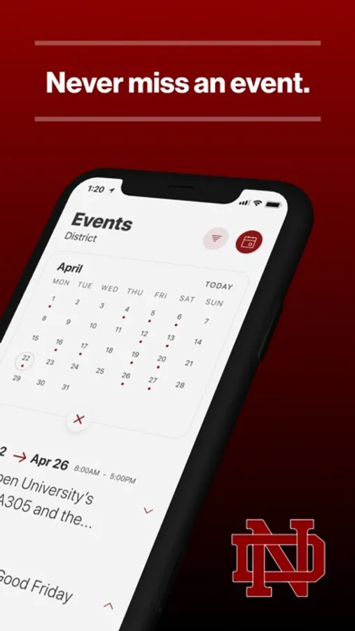 The event section shows a list of events throughout the district. Users can add an event to your calendar to share the event with friends and family with one tap.
