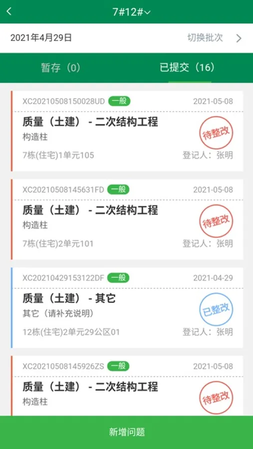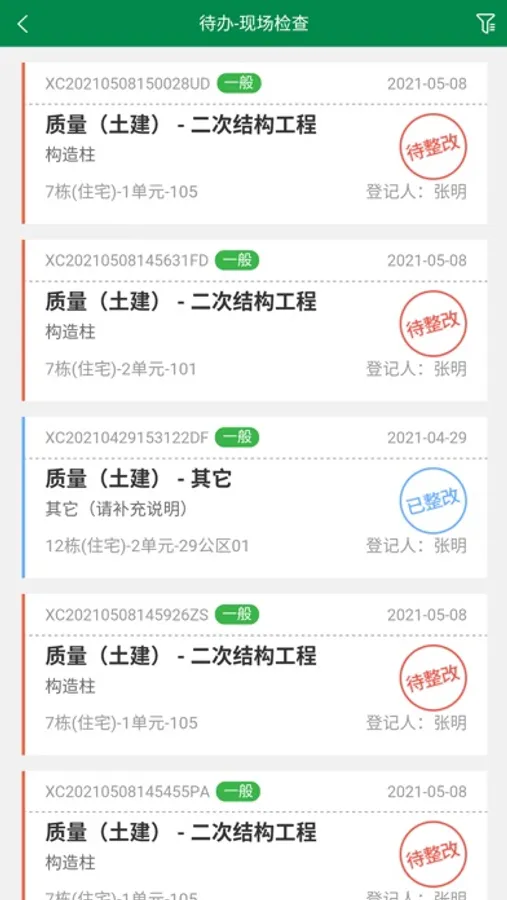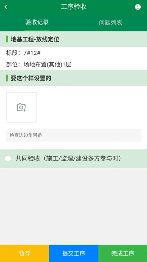1)现场巡检:建设单位与监理单位在日常的巡检中,发现土建,安装中存在的质量问题或者安全问题时,通过本APP可以快捷登记问题,同时分配给相应的责任单位进行整改。