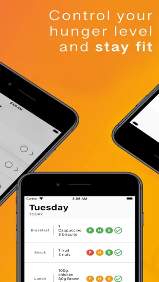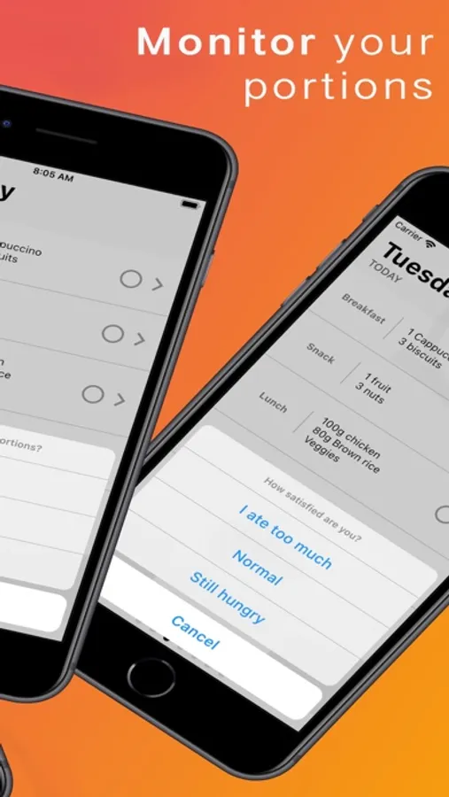 Dieetly will ask you 3 questions each time you mark a meal as completed. Those questions will help you becoming aware of your stomach fullness. After a few weeks, you will start feeling when it's time to eat and when it's not by just listening to your stomach.
