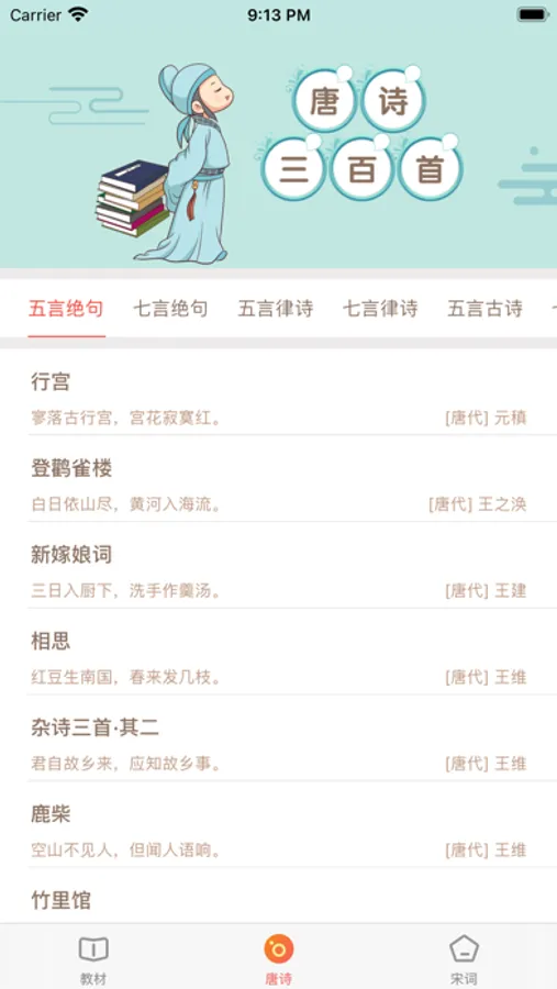 本软件挑选了小学生教材内古诗文、唐诗三百首、宋词三百首,所选出自大家之手、流传千古的古诗名篇,更有详细注释帮助理解掌握古诗词精华,轻松领略唐诗宋词的优美华章。