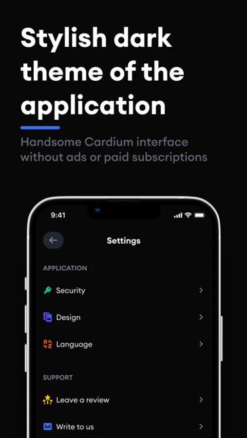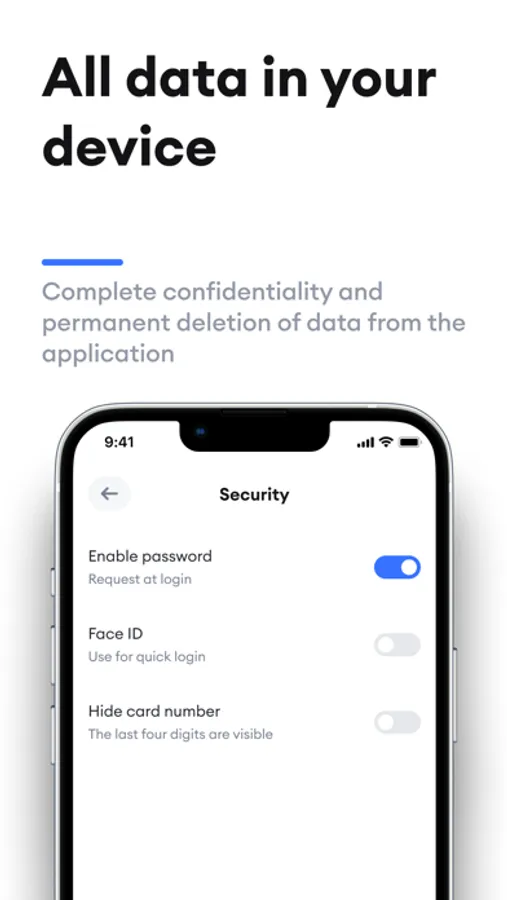 Complete confidentiality allows you to make the process of deleting data from the application irreversible. Moreover, the Cardium app is encrypted with sophisticated algorithms to ensure the best possible security for your data.