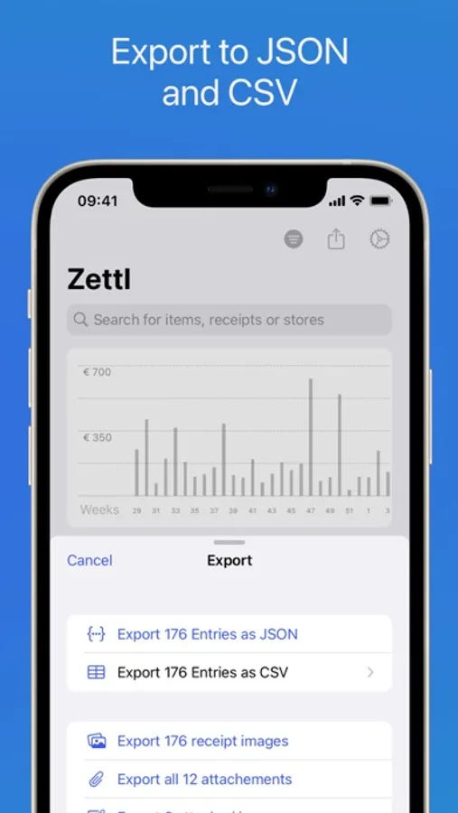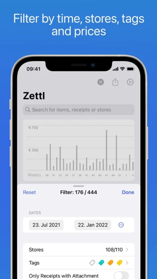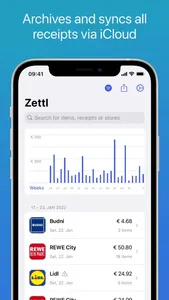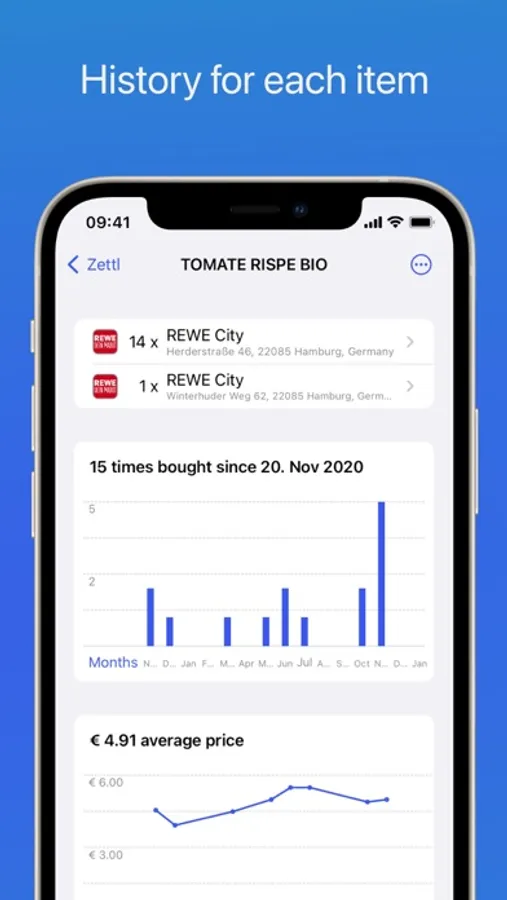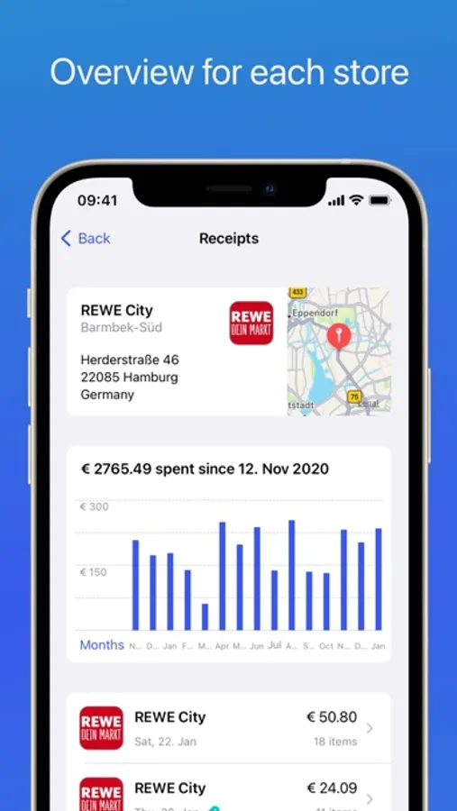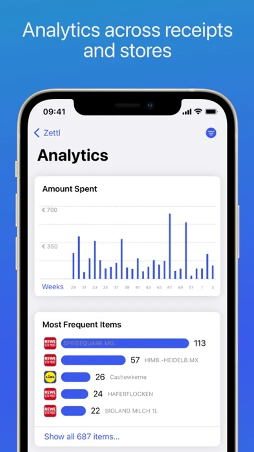 Extensive analytics about stores and items give you an overview of all your purchases.