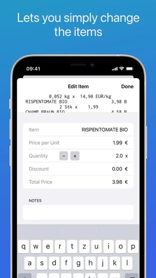 Editing items is fast and easy, and details like price per unit or discounts can be set as well.
