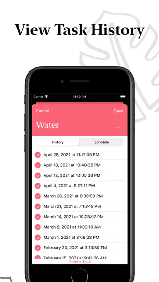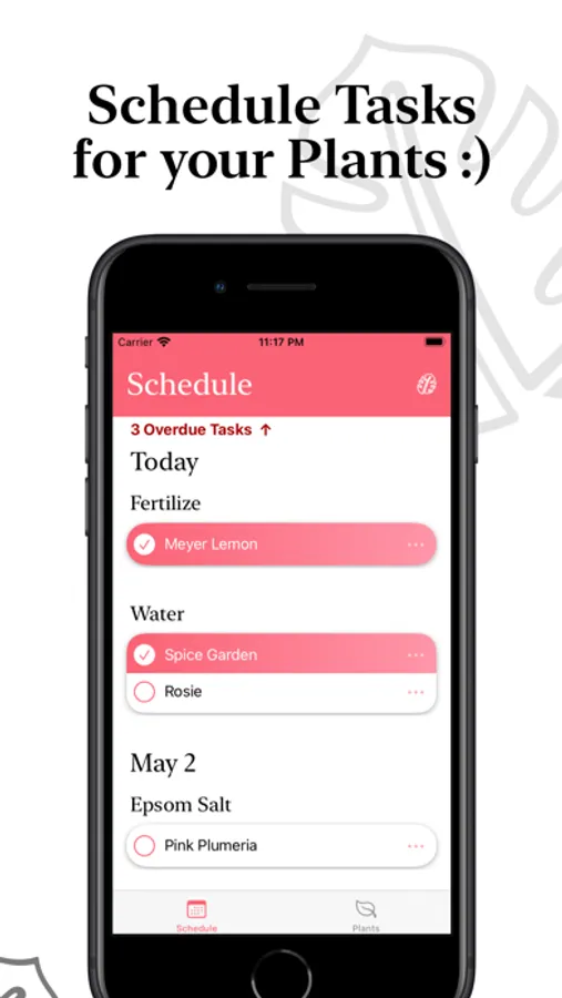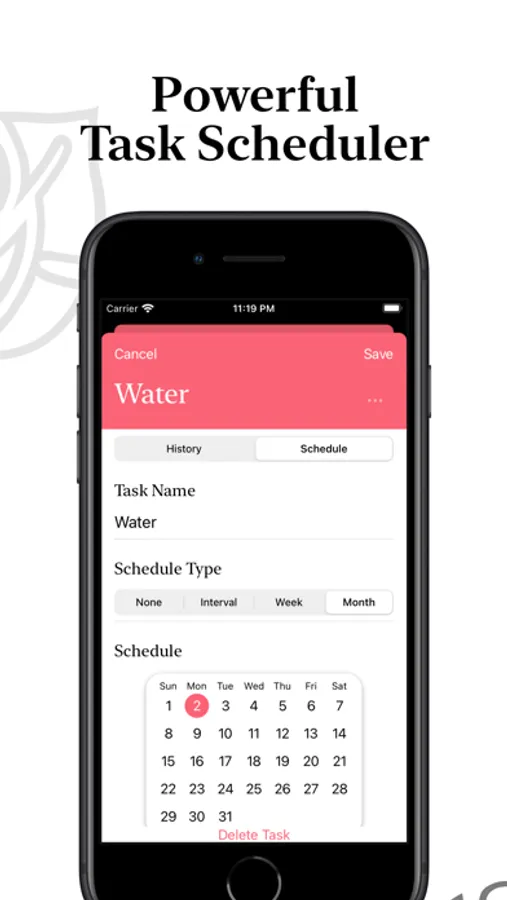 - Water, Fertilize, Repot, Mist, Prune, Pick, Plant? No problem! Create any tasks as you want for a plant.