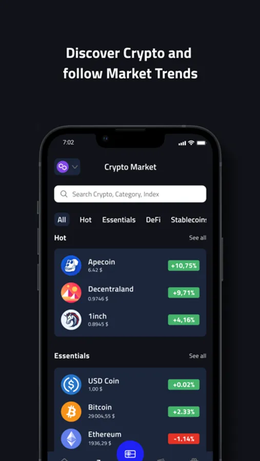 - Discover: Explore 200+ cryptocurrency sorted by category (DeFi, Play to earn, NFT...) in our "Markets" section and track their prices.