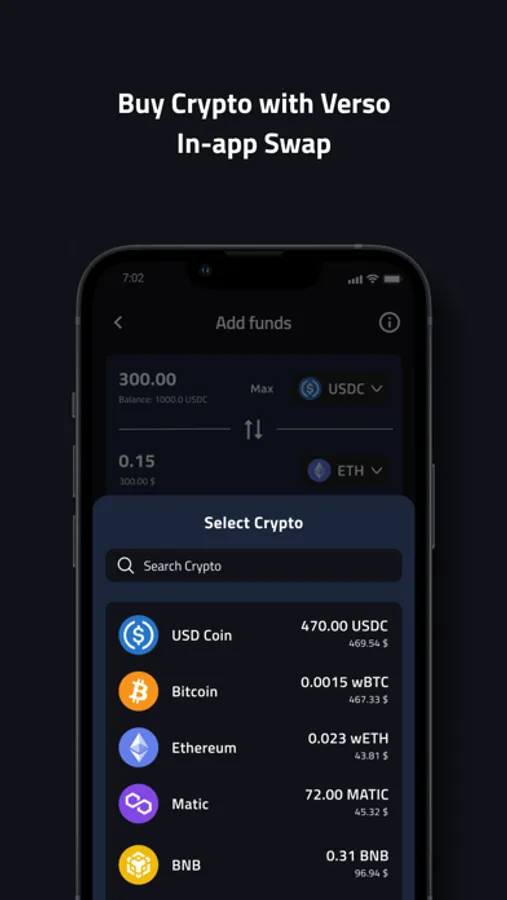 Verso rewards you with USDC crypto : the USDC token is a stablecoin that you can swap in Verso for Bitcoin, Ethereum, Binance token, Polygon…