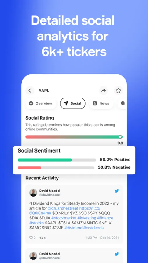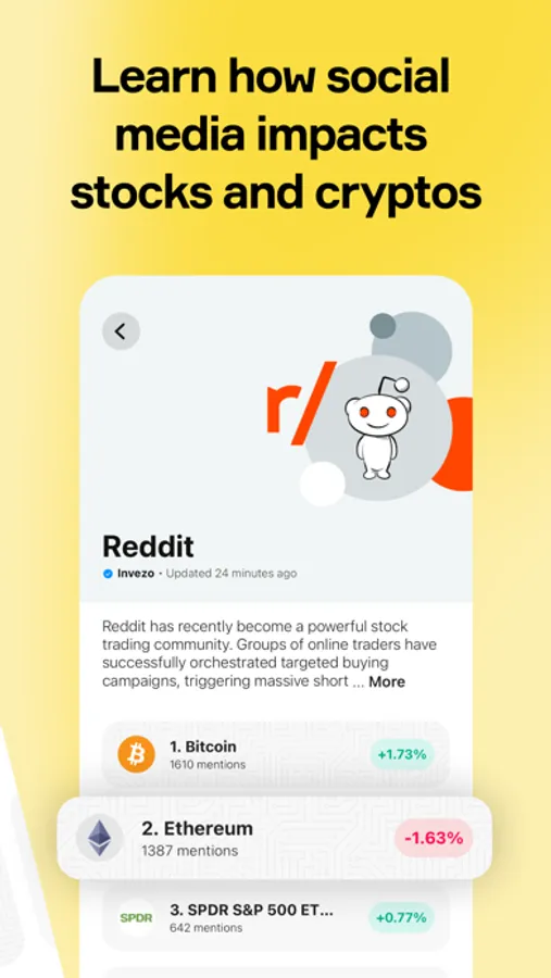 Sentiment Analysis: For any given stock or crypto, we analyze the percentage of positive and negative online discussion about a stock or crypto. Every ticker on the Invezo app displays sentiment analysis so you know how a stock or crypto is being discussed online.