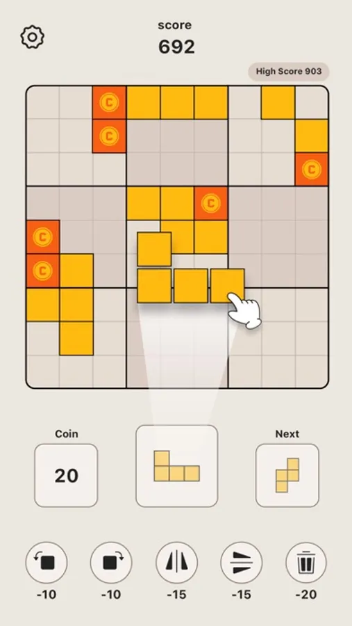 #Ahop - is a casual puzzle game using molded blocks in a random order to remove horizontal and vertical lines, or 3x3 squares.