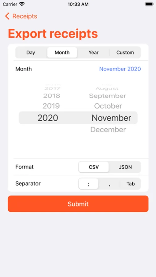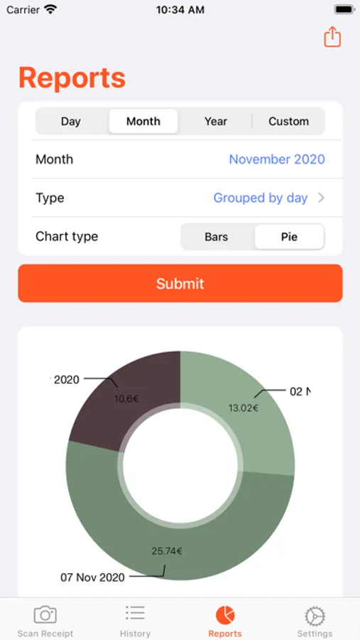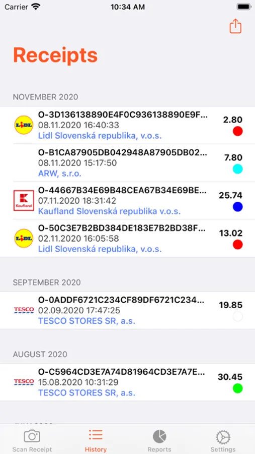 Receipts are grouped and ordered by date. Users can review them anytime, perform searches in receipts or delete receipts.