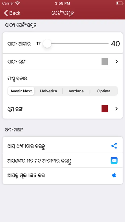 Includes font size settings