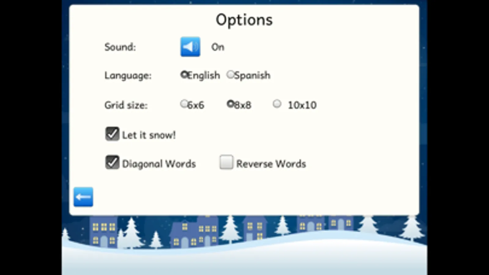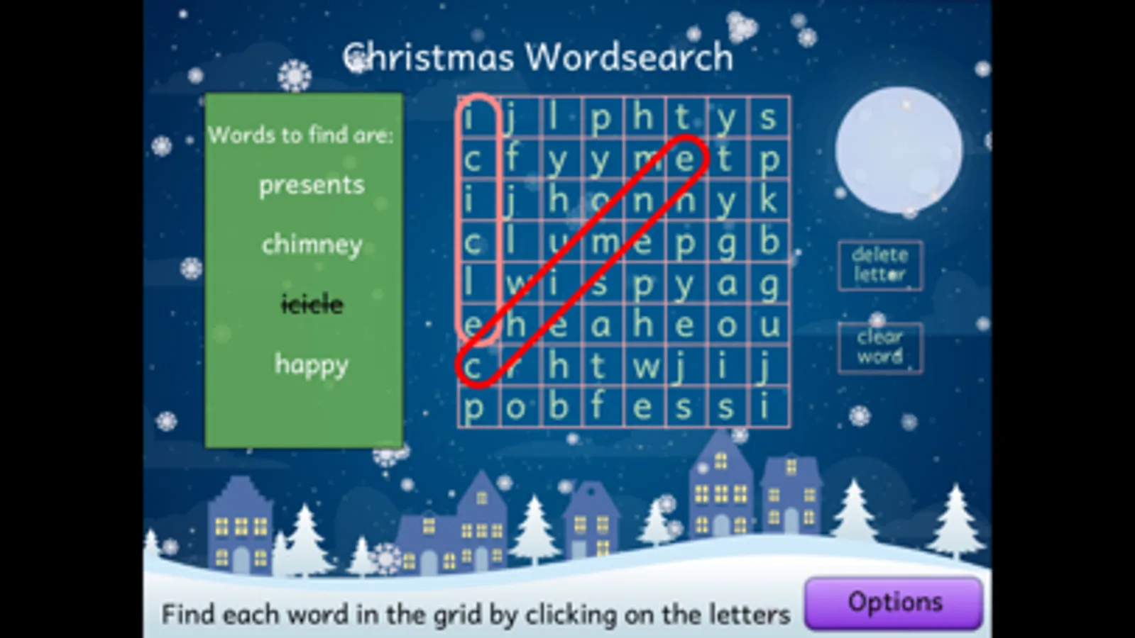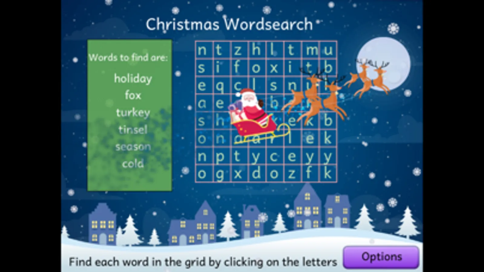 All the time while children are finding words, snow will come down, and when all the words in the grid have been found, Father Christmas on his sleigh will cross the screen!
