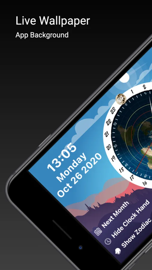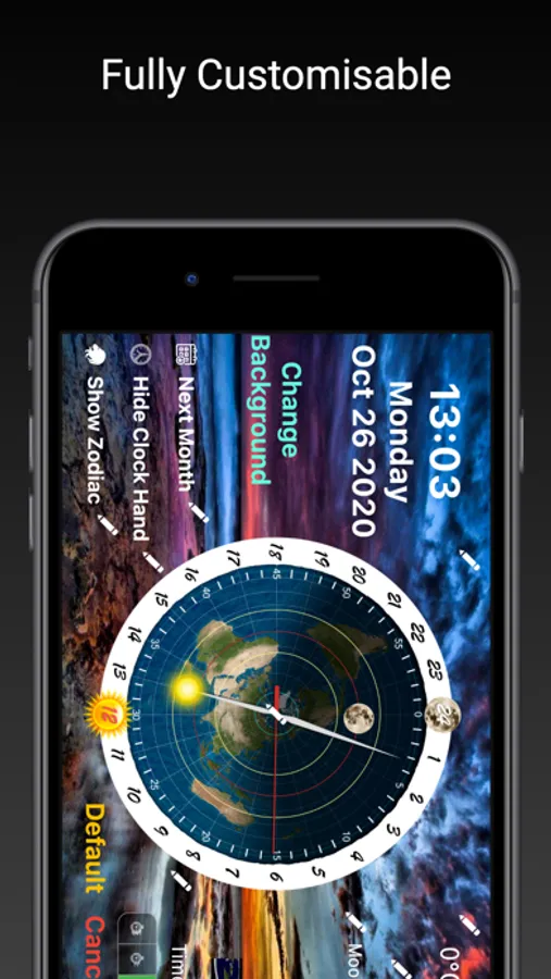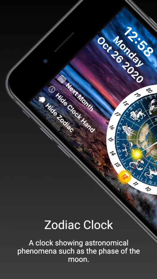 Analog sun & moon Zodiac Clock with day and night: Shows the sun and moon positions along with moon phases and day and night.Watch as the sun makes its daily journey around the face of the earth. Accurate moon size calculations.