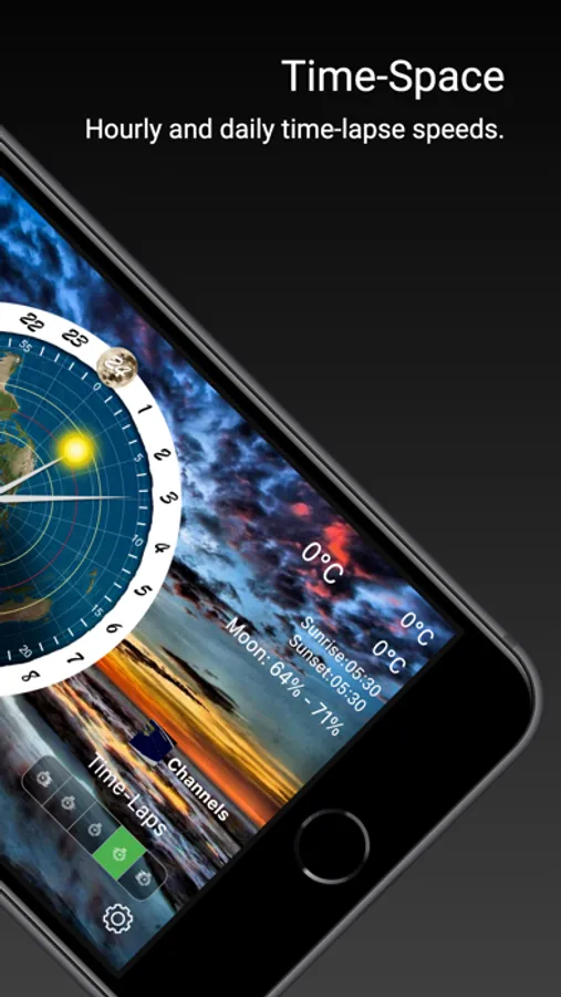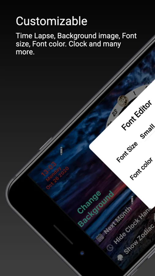 Fully Customizable :- Time-Space, Background image, Font size , Font color. Clock style. Just ht the settings icon in the bottom right corner and select your view for making it editable. Hit on the image and switch and edit Time-Lapse function Hourly and daily time-lapse speeds.