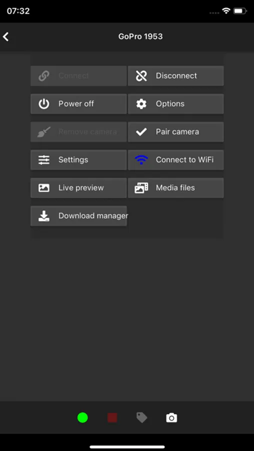 - Control GoPro cameras via WiFi (one camera at the same time only!): Hero 4 (Session/Silver/Black Edition), Hero 5 Session, Hero 5/6/7, Fusion.