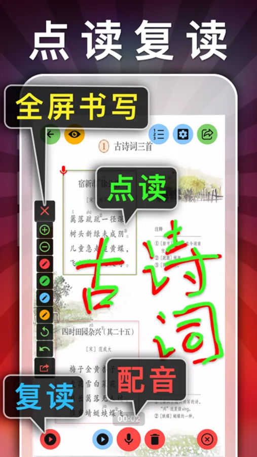 1、点读复读、全屏手写;