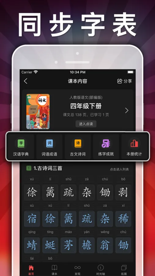 6、小学语文同步学、笔画笔顺书写练字功能;