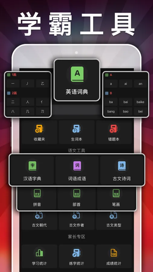 3、汉语字典、拼音、笔画、边旁部首搜索功能;