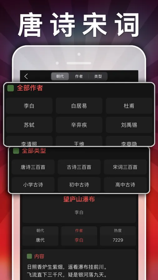 5、古诗文搜索、诗人搜索等功能;