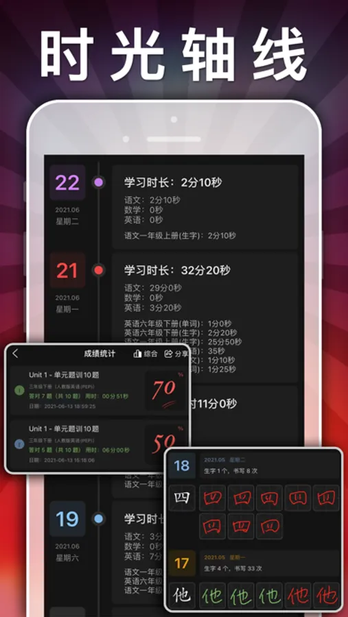 学习成就:图表统计学习情况,孩子的学习情况、训练成果五目了然。