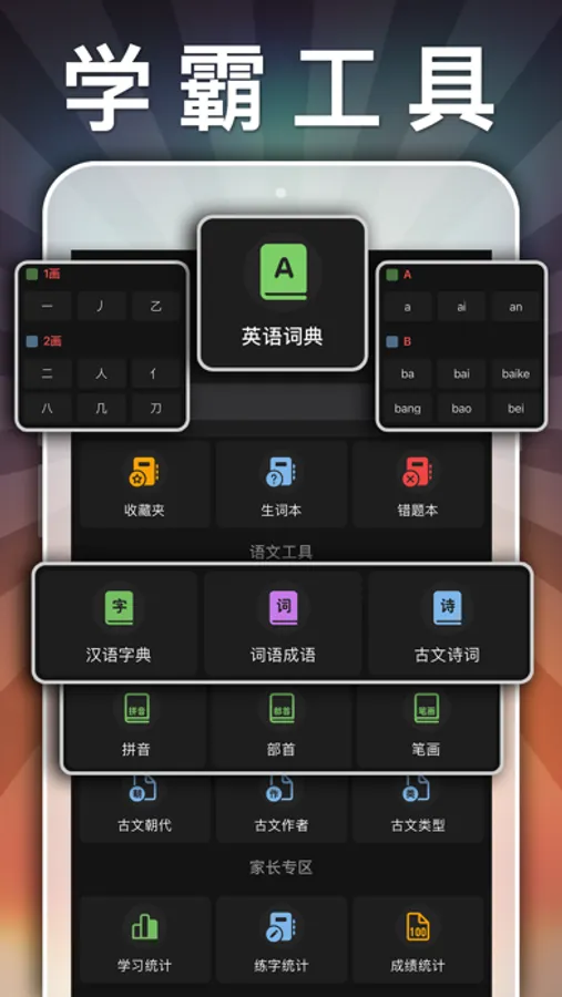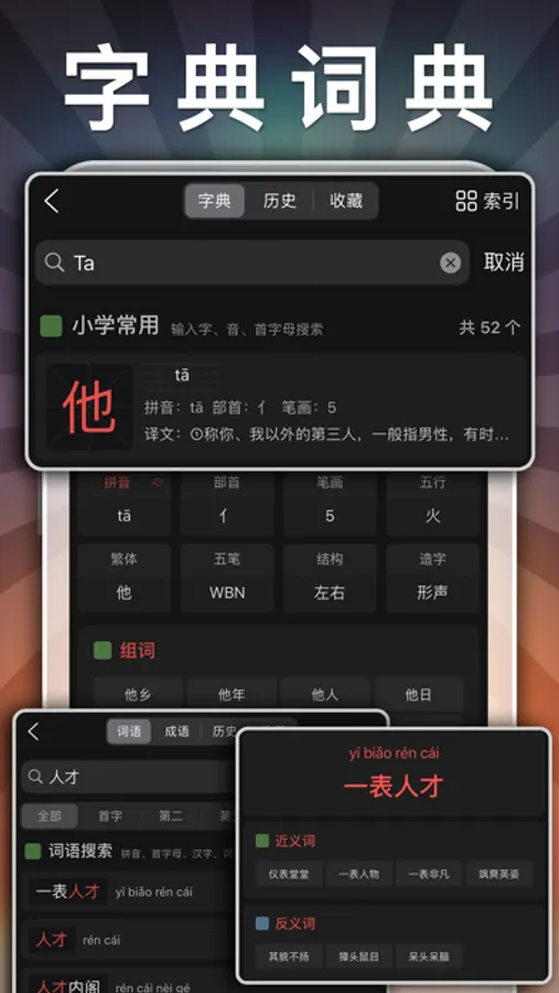 3、汉语字典、拼音、笔画、边旁部首搜索功能;