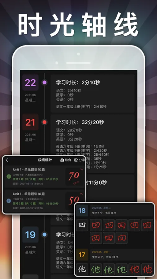 学习成就:图表统计学习情况,孩子的学习情况、训练成果五目了然。