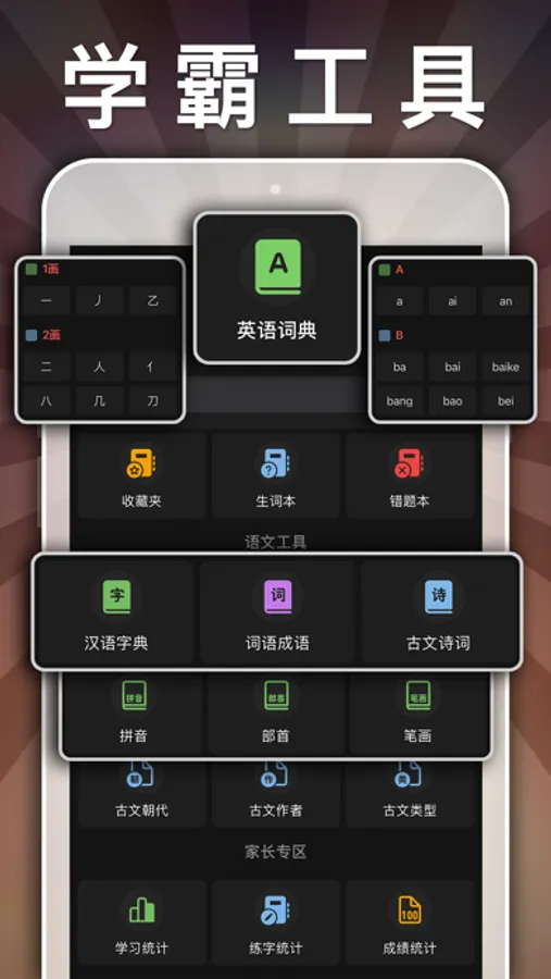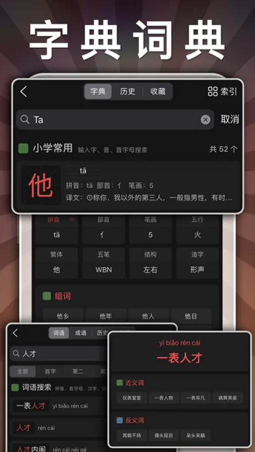 3、汉语字典、拼音、笔画、边旁部首搜索功能;