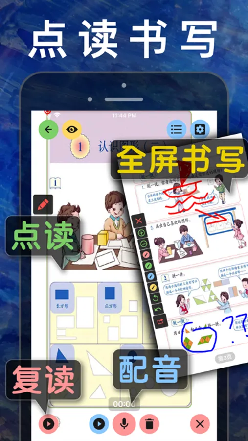 1、点读复读、全屏手写;