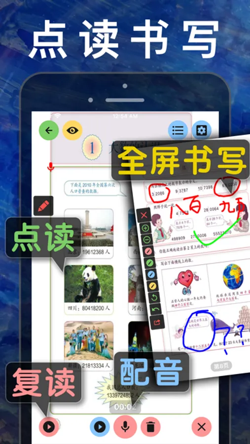 1、点读复读、全屏手写;
