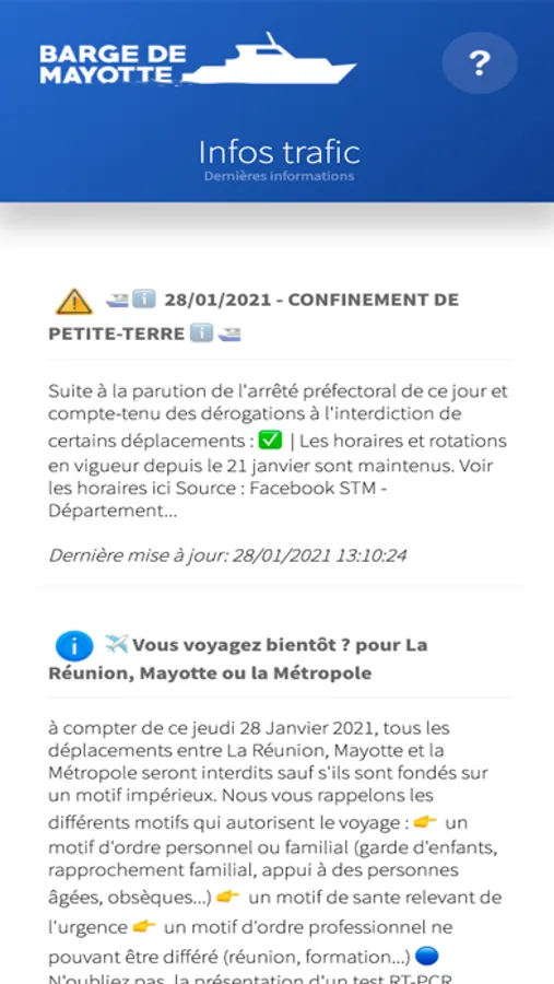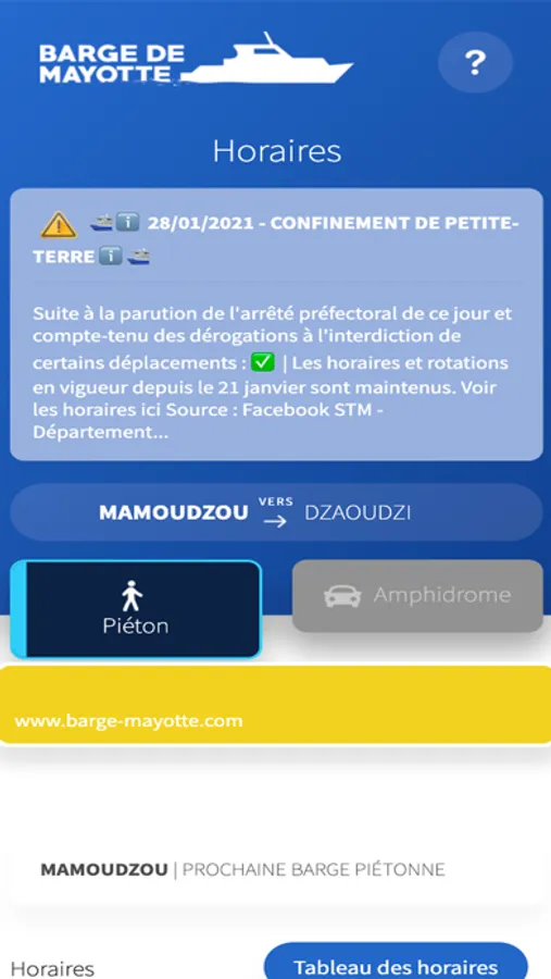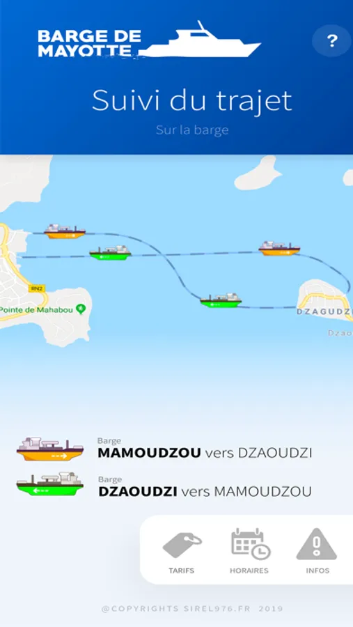 Cette application va permettre aux passagers de la Barge d’être informé sur les horaires, les retards, les incidents et suivre sur une carte l’avancement des Barges, ainsi que toute information qui concerne le trafic dans Mamoudzou ou Dzaoudzi,Pamandzi.
