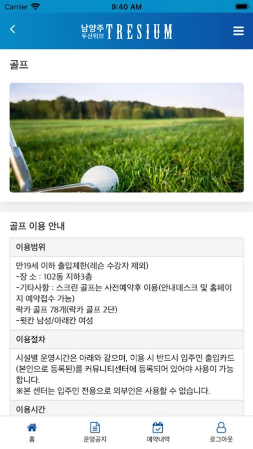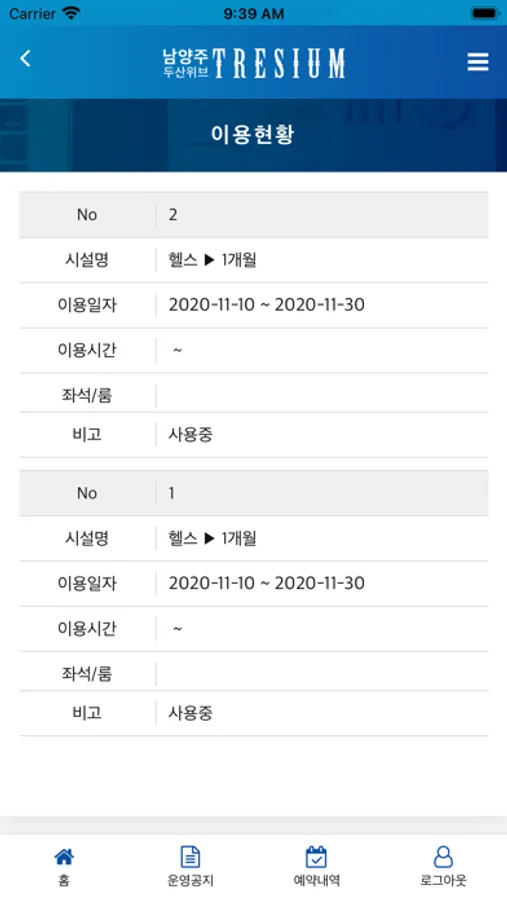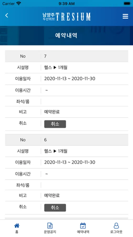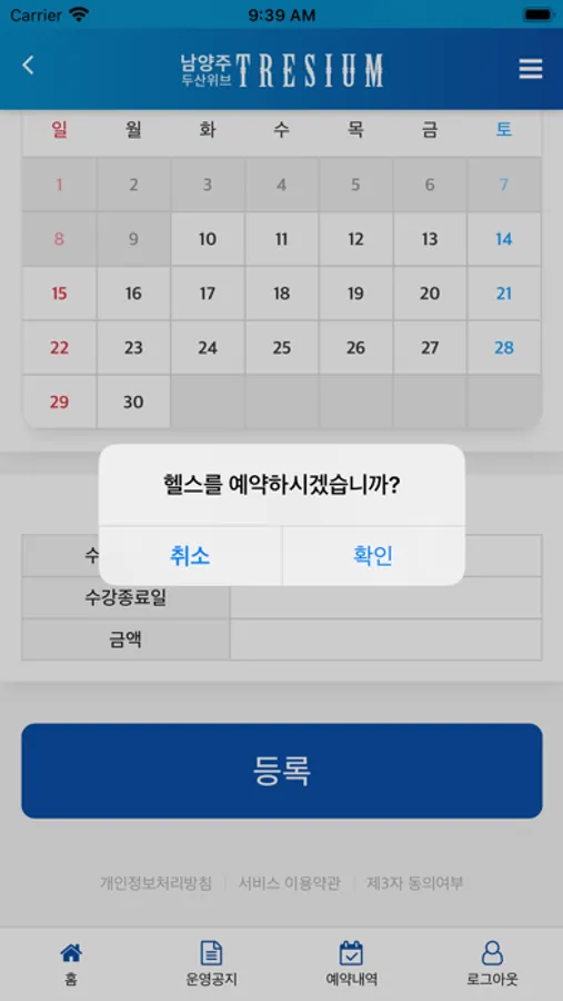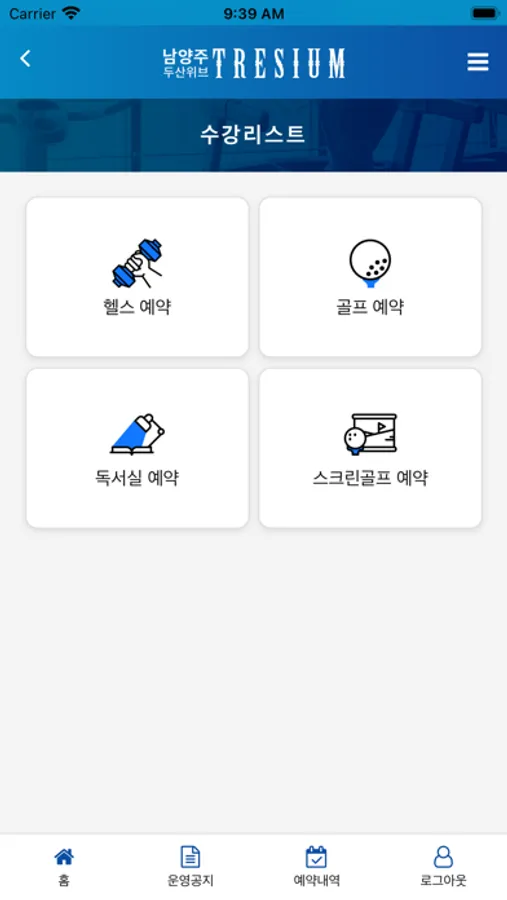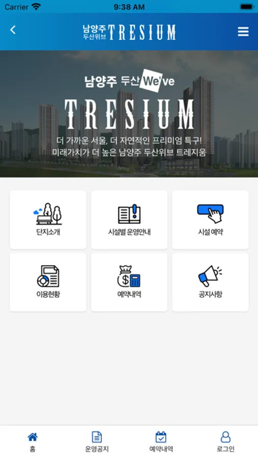 남양주 두산위브 트레지움은 입주민분들께서 시설예약, 강좌예약, 이용내역을 확인 할 수 있는 서비스 입니다