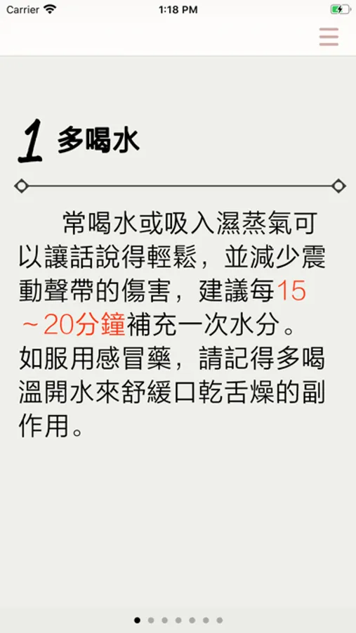 1. 自主練習:包含腹式呼吸、嗓音功能運動、放鬆運動、共鳴治療…等課程,請配合語言治療師之建議操作。