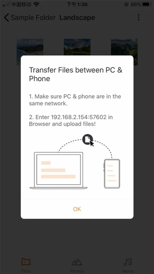 Just open browser and enter the URL provided by The FileTransfer, and drag or upload files to browser, then transfer is completed!