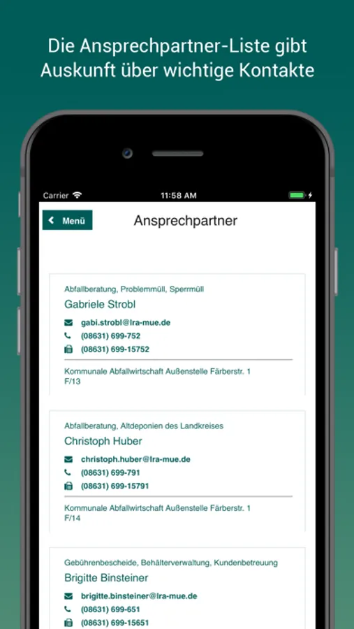 • Die Ansprechpartner-Liste gibt Auskunft über alle Stellen in der Abfallwirtschaft mit Telefonnummer und E-Mail-Adresse.