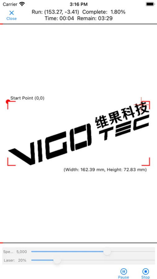 Vigo Works is a control application designed for small laser engraving equipment developed by VIGOTEC. It can be used to control the device to print pictures, contours or cuts on the suitable surface of the engraved object. Vigo Works connects devices wirelessly (User’s WLAN or Device’s Wireless AP). Users can import sample pictures coming with the app, or import pictures by accessing the camera or album. Users can clip, zoom, rotate or add text to the imported pictures. Users can operate the device directly or upload converted code files to the device so that the device can work offline. Users can connect to the device at any time and see the progress of working when the device is working offline.
