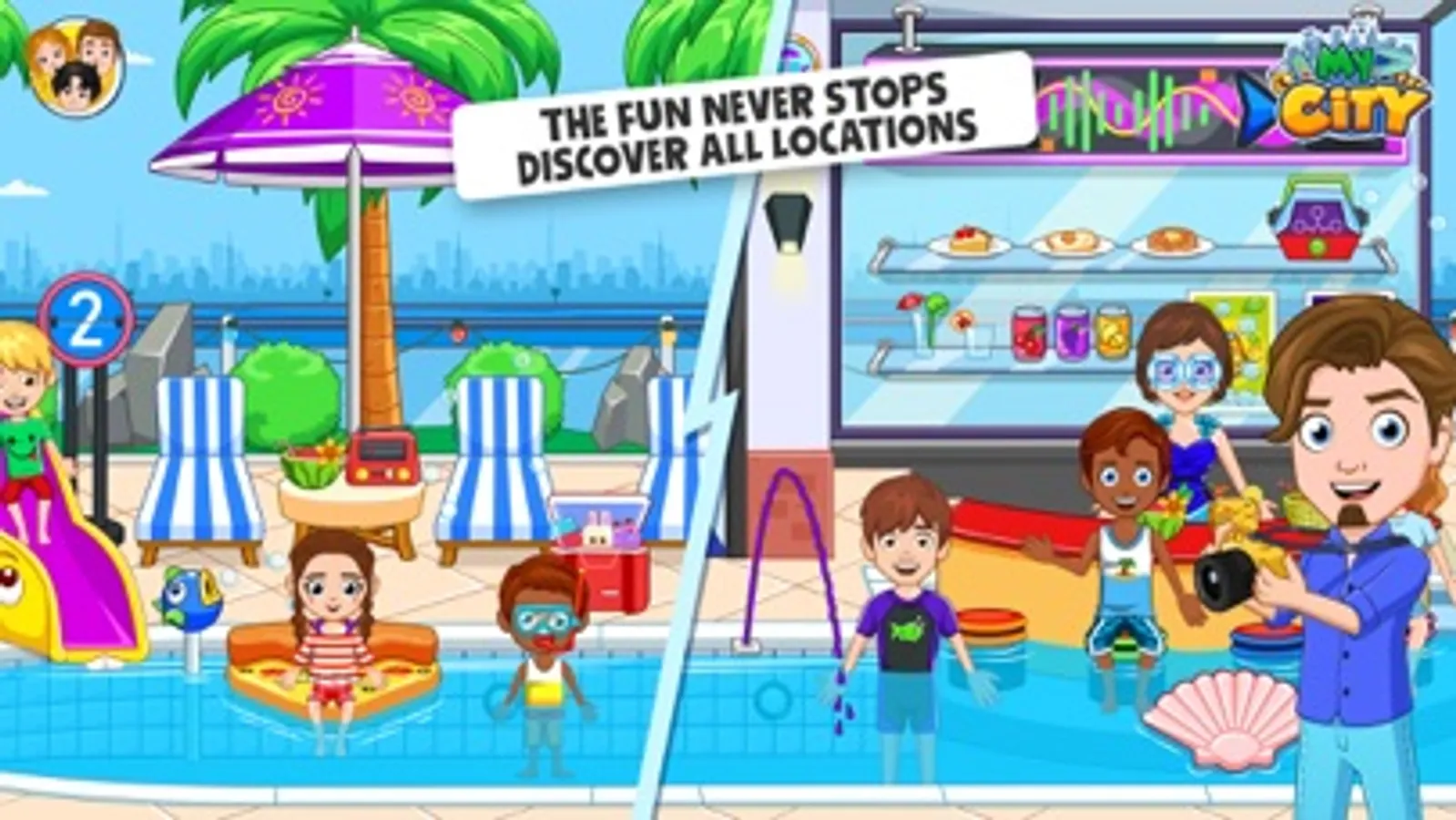 Prepare yourselves for the best holiday in My City: Hotel games! Discover the lobby and check-in to experience why those who visit the hotel refuse to check-out! Discover the restaurant and listen to music, take a nap in the Family room, VIP room or Honeymoon suite or indulge in wellness. Hang out at the spa to experience rest and relaxation at its finest. Make sure to also find your way to the rooftop and be amazed at the biggest pool ever to hit My City! What are you waiting for? Book your next trip for the holidays and travel to My City: Hotel to make sure the fun and adventure never stops!