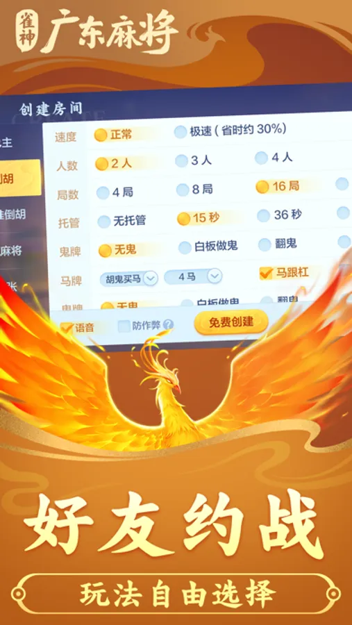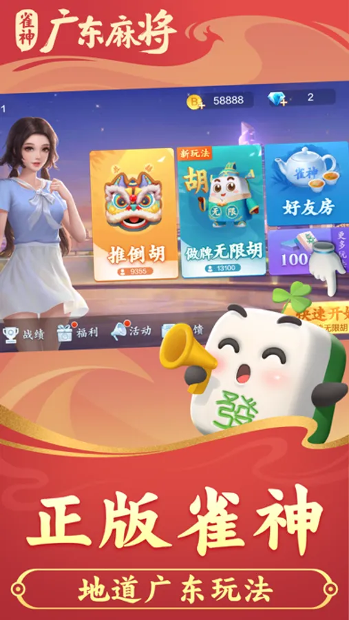 全新雀神广东麻将APP,拥有正宗广东麻将推倒胡、100张、以及红中王等多种玩法,好友约牌可自由选择玩法搭配!