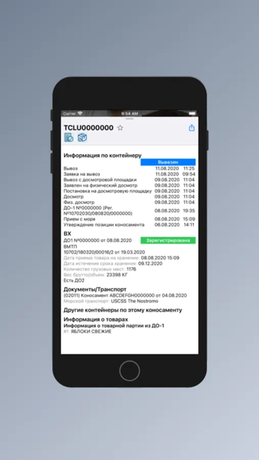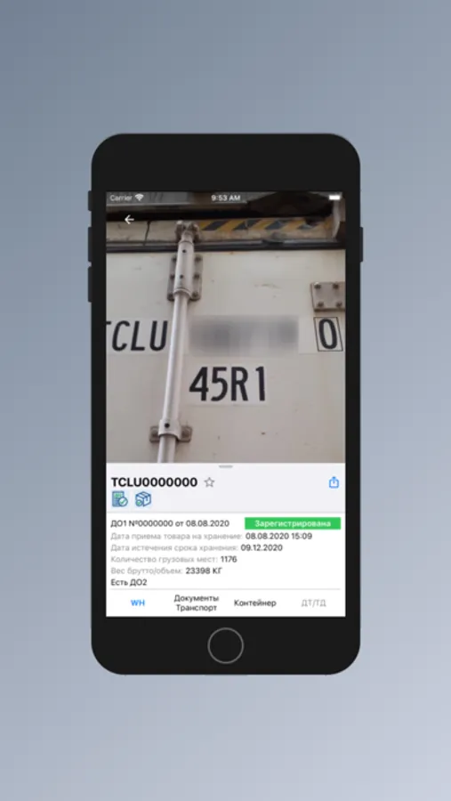 Приложение для онлайн отслеживания информации о совершении таможенных операций в отношении контейнерных перевозок, способное идентифицировать контейнер посредством сканирования его номера и предоставить сведения о товарной партии в контейнере, операциях с контейнером, а также сведения о транспортных документах, месте хранения, складских документах учета (ДО1, ДО2) и таможенных документах (ДТ, ТД)