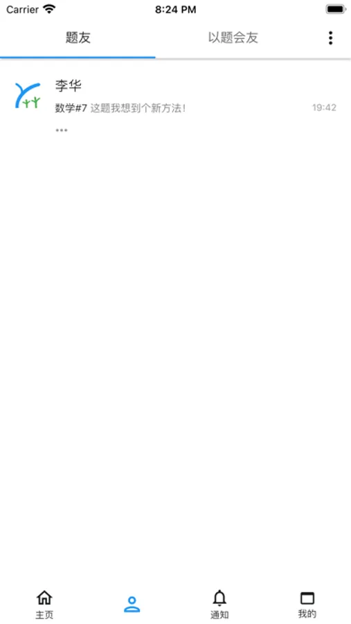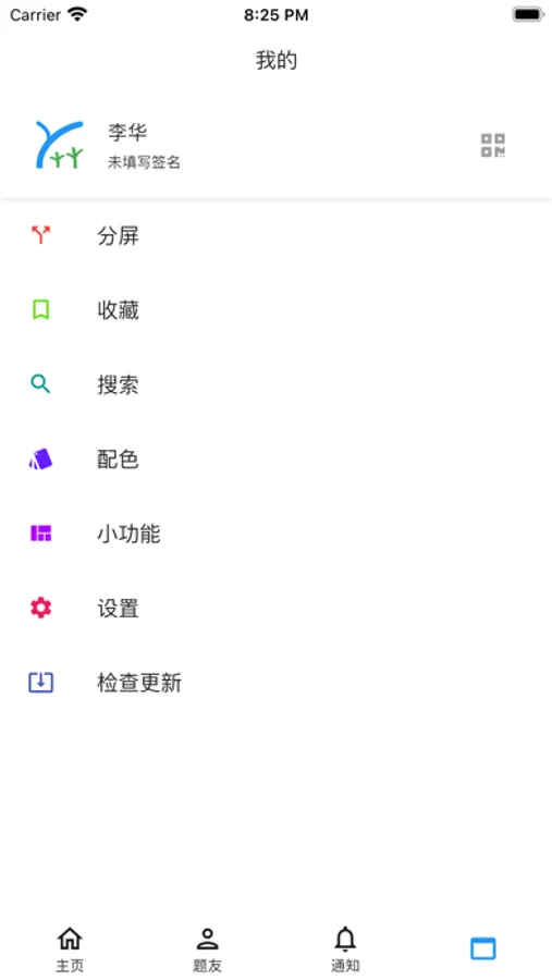 本应用是一个为高中理科题设计的App,仅限讨论理科题目(数理化生等)。应用的主页展示关注的题目、待回答的题目等内容。题目页显示讨论的理科题。应用包含通知页。应用其余功能位于"我的"页,包括分屏、搜索、收藏、配色、小功能、设置、检查更新等等。