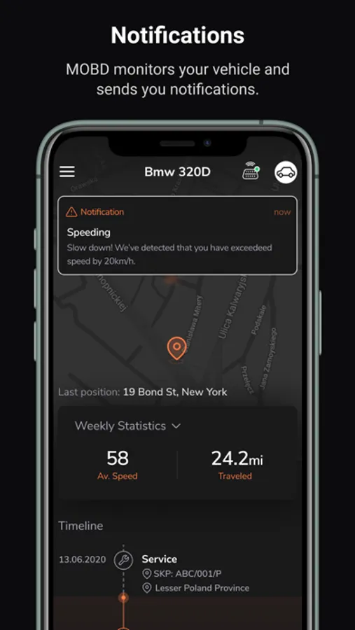 MOBD device plugs into the diagnostics socket in your vehicle and gives your phone access to all car data and diagnostics.