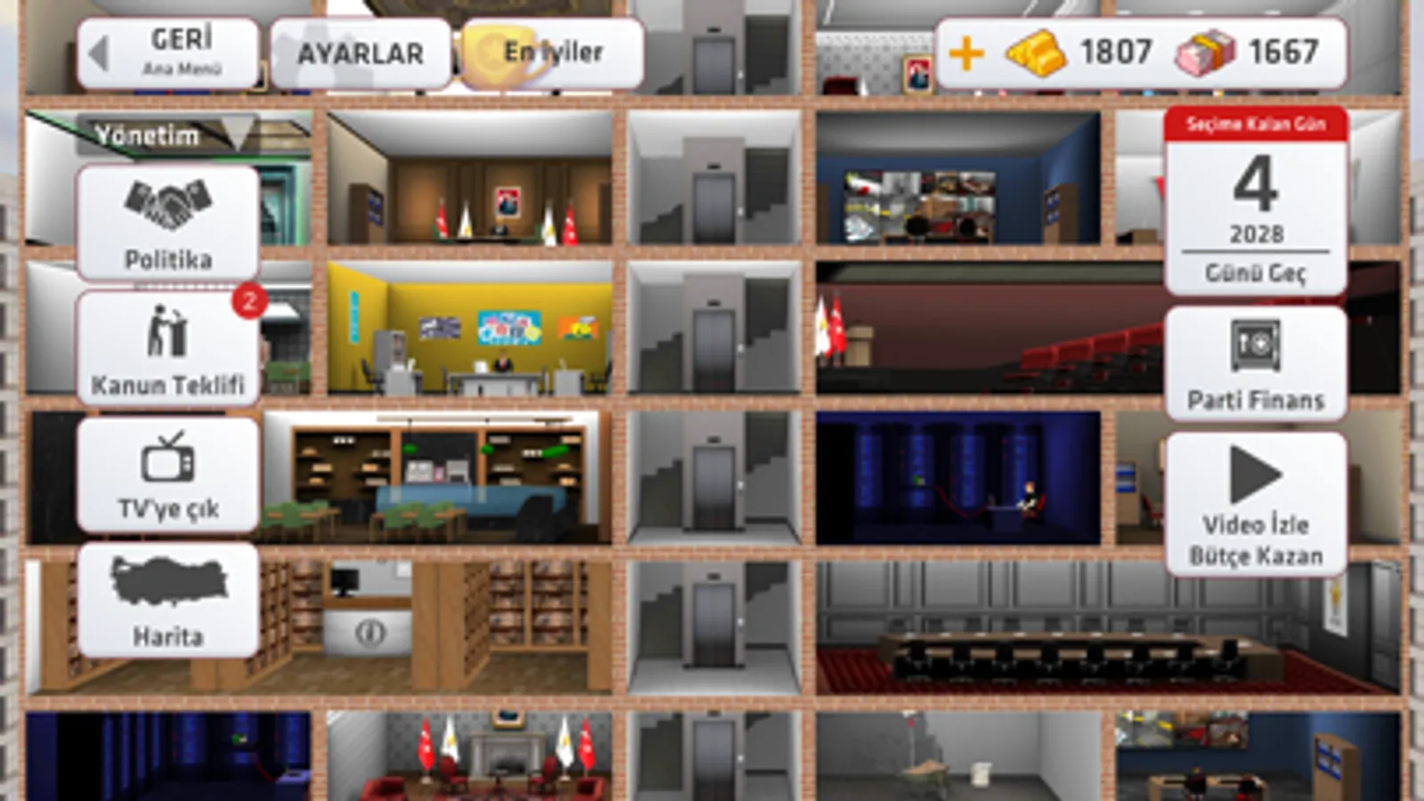 Choose your favorite Turkish political party and leader, or create your own party with your own character! Travel Turkish cities with your party bus, stand out from your opponents on the road. Participate in the rally of sightseeing and activities, join TV programs and get attention of voters. Build alliances and set policies. Be in power, establish the laws in the assembly, develop the country and cities.