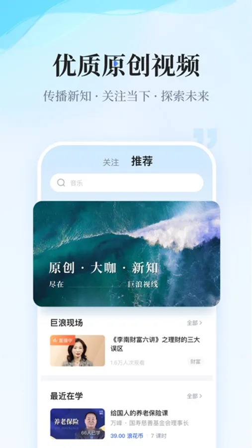 “巨浪视线“是和讯在线信息咨询服务有限公司出品的大咖新知分享平台,内容涵盖财经、投资、教育、管理、医疗、科技、音乐、时尚、文化、艺术等领域。通过名人访谈视频、对话现场直播、大咖精品课等形式,分享专业的思想、观点、经验。旨在帮助用户获得全面、深刻的知识和技能,实现自我提升,遇见更好的自己。
