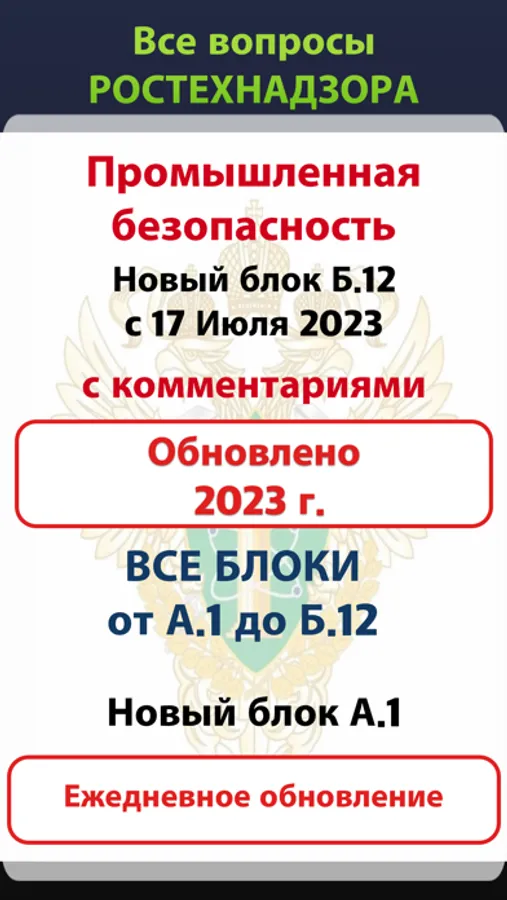 Данный сборник полностью соответствуют сборнику Ростехнадзора. Приложение позволяет пройти тестирование по актуальным на данный момент категориям:
